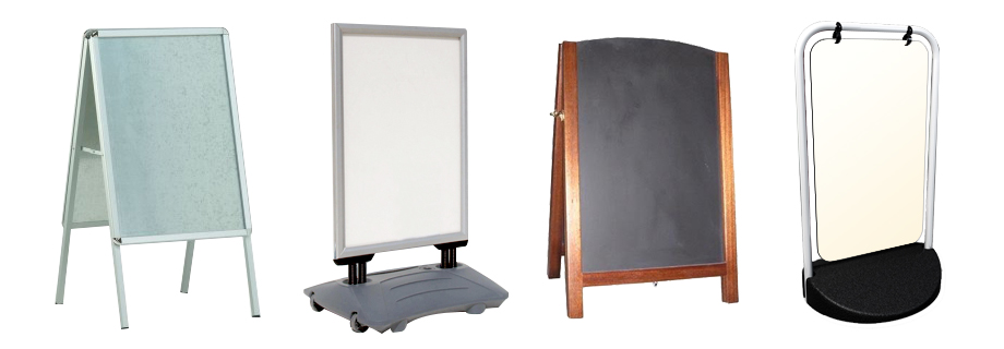 A-boards are a great form of pavement advertising, perfect for city centres and busy high streets. We offer many different styles of A-board from our standard poster frame to high-quality chalkboards and even swinger boards. We can even fit a custom poster design for you here: